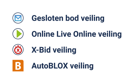 • X-Bid veiling: zodra de veiling is gestart kunt u uw (automomatische) biedingen plaatsen. Als de veiling het tijdstip van sluiten bereikt dan start de X-Bid. Tijdens de X-Bid komen alle kavels nog één keer voorbij. Iedereen krijgt dan nog een kans om het hoogste bod te plaatsen. Als de timer afloopt zonder dat er verder wordt geboden is het kavel afgesloten.